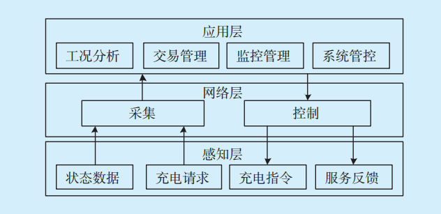 1)感知層:上行方向以系統(tǒng)的前端設(shè)備作為媒介采集電動(dòng)汽車(chē)充電接口類(lèi)型數(shù)據(jù)、電池?cái)?shù)據(jù)狀態(tài)、充電所需時(shí)間、充電樁運(yùn)行狀態(tài)等服務(wù)基礎(chǔ)數(shù)據(jù),并采集用戶的充電服務(wù)請(qǐng)求,包括充電預(yù)約及充電模式等請(qǐng)求指令。下行方向接收系統(tǒng)的充電服務(wù)控制指令、充電服務(wù)指標(biāo)反饋等信息。