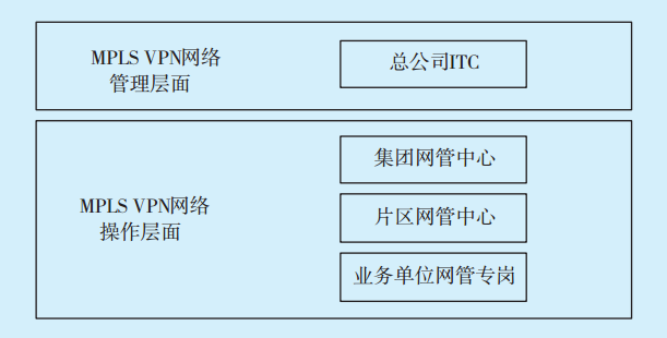 該企業(yè)集團的MPLS VPN網絡運維體系的組建以總公司、二級單位等行政管理歸屬為基本單元,采用運維管理集中、運維操作分散的模式:總公司ITC負責統(tǒng)一的運維管理;集團網管中心、片區(qū)網管中心和業(yè)務單位網管專崗分別按照所屬層級進行具體的維護工作。