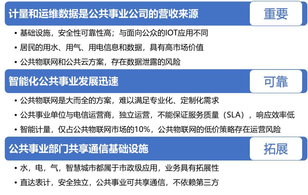 相比于公共的物聯(lián)網(wǎng)方案,專用物聯(lián)通信方案更加符合公共事業(yè)應(yīng)用和智慧城市應(yīng)用的要求,保證客戶的運營安全,提高運維效率,推動產(chǎn)業(yè)持續(xù)創(chuàng)新和升級。