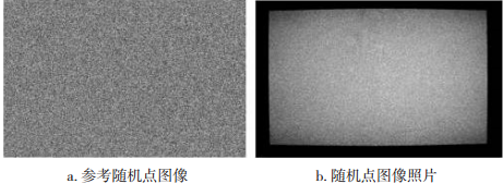 為了解決校正系數(shù)預(yù)測(cè)的問(wèn)題,本文提出采用隨機(jī)點(diǎn)圖像和POC算法構(gòu)建校正系數(shù)預(yù)測(cè)模型。首先將隨機(jī)點(diǎn)圖像的背景設(shè)置成黑色,然后對(duì)隨機(jī)點(diǎn)圖像進(jìn)行圖像采集并處理,最后聯(lián)合已知的隨機(jī)點(diǎn)參考圖像進(jìn)行各像素點(diǎn)的位移預(yù)測(cè)以獲取校正模型[16]。隨機(jī)點(diǎn)圖像如圖4所示,展示了參考隨機(jī)點(diǎn)圖像和圖像采集系統(tǒng)對(duì)隨機(jī)點(diǎn)圖像進(jìn)行圖像采集獲取到的照片。