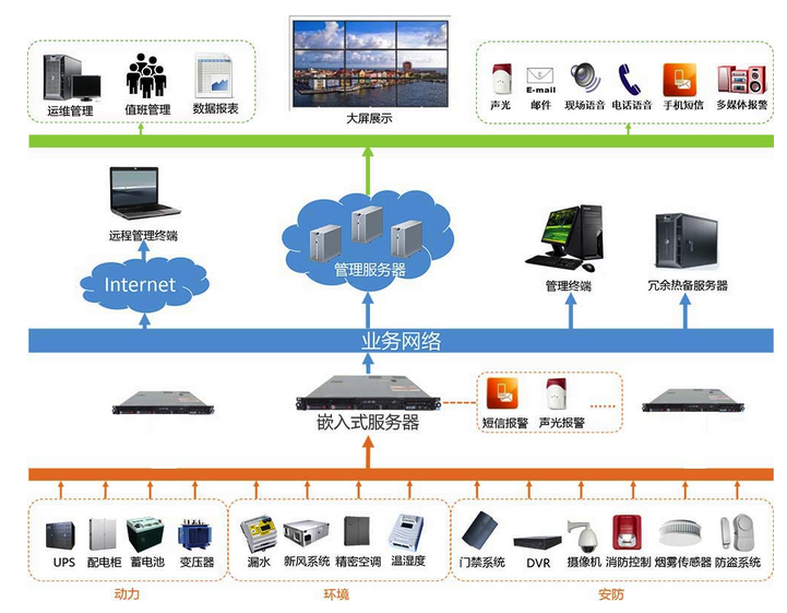 ? 動力設(shè)備監(jiān)控:如配電柜、開關(guān)、UPS、光電系統(tǒng)、風(fēng)電系統(tǒng)、發(fā)電機、蓄電池組等