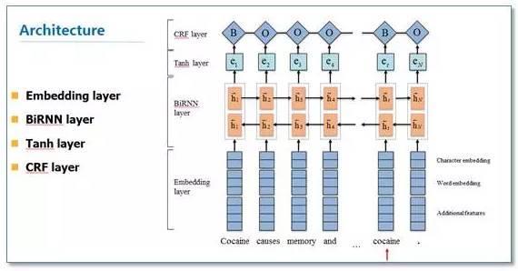目前常見的基于深度學(xué)習(xí)的序列標(biāo)注模型有BiLSTM-CNN-CRF。它主要由Embedding層(詞向量、字向量等)、BiLSTM、tanh隱藏層以及CRF層組成(對(duì)于中文可以不需要CNN)。我們的實(shí)驗(yàn)表明BiLSTM-CRF可以獲得較好的效果。在特征方面,由于秉承了深度學(xué)習(xí)的優(yōu)點(diǎn),所以無需特征工作的鋪墊,使用詞向量及字向量就可以得到不錯(cuò)的效果。