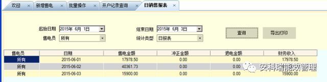系統(tǒng)還提供了多個報表以供查詢,分別是日/月/年財務(wù)銷售統(tǒng)計報表、失聯(lián)表/通訊管理機查詢報表、能耗查詢報表、實時報警/歷史報警查詢報表,支持導(dǎo)出。以下是財務(wù)報表和預(yù)付費表日用能查詢報表: