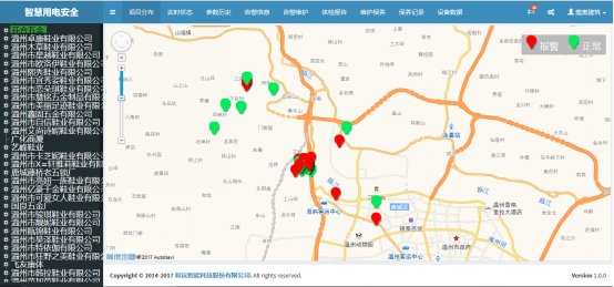 對溫州市蘊奧建筑工程有限公司展開用電安裝業(yè)務的溫州卓康鞋業(yè)、木草鞋業(yè)、星越鞋業(yè)等42家公司進行智慧用電安全傳感終端、配套系列傳感器以及智能網(wǎng)關(guān)的布置。溫州市蘊奧建筑工程有限責任公司通過賬號登陸智慧用電安全隱患監(jiān)管云平臺實現(xiàn)對其經(jīng)營所有公司的集中用電監(jiān)管。