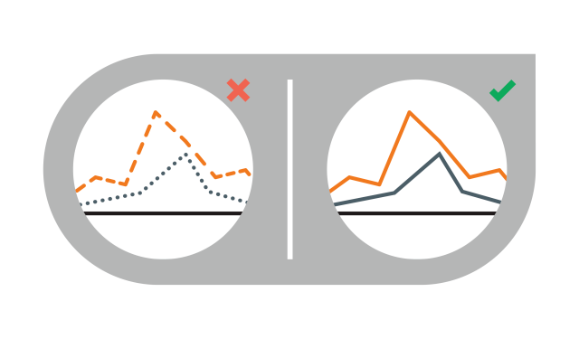 虛線容易分散注意力。相反,使用實(shí)線和顏色反而容易區(qū)分彼此的區(qū)別。