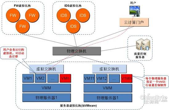 l 部署流量控制服務(wù)器:它是流量控制管理的中心,接受并部署用戶流量的安全策略,當(dāng)用戶業(yè)務(wù)虛擬機(jī)遷移時(shí),負(fù)責(zé)流量牽引策略的遷移落地;該服務(wù)器可以是雙機(jī)熱備,提高系統(tǒng)安全性,也可以采用虛擬機(jī)模式。同時(shí),在虛擬計(jì)算資源池內(nèi)安裝流量控制引擎:具體方法是在每個(gè)物理服務(wù)器內(nèi)開一個(gè)虛擬機(jī)運(yùn)行流量控制引擎,負(fù)責(zé)引導(dǎo)該物理服務(wù)器上所有虛擬機(jī),按照安全策略進(jìn)行流量的牽引;
