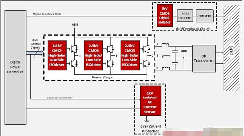 反饋到控制器的電流由一個4mmx4mmx1mm的CMOS隔離交流電流感應(yīng)器提供(其1kV隔離等級受限于封裝,更大封裝版本有高達(dá)5kVrms等級)。此單芯片感應(yīng)器具有比電流感應(yīng)變壓器更寬的溫度范圍、更高精度及可靠性。該傳感器在每個周期復(fù)位,由數(shù)字控制器產(chǎn)生的逆變器門控制信號產(chǎn)生周期信號,從而無需外部復(fù)位電路。電網(wǎng)反饋是系統(tǒng)反饋控制機(jī)制的重要組成部分。電阻衰減器用于降低電網(wǎng)電壓到PWM調(diào)制器兼容的范圍,把正弦波輸入轉(zhuǎn)換成一個離散的PWM波形,并且由CMOS數(shù)字隔離器安全隔離。
