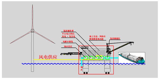 海上風(fēng)場(chǎng)制氫平臺(tái)可根據(jù)需求集成海水淡化、電解水制氫、氫處理儲(chǔ)存等基本功能,同時(shí)面向制氫、風(fēng)場(chǎng)保障等多項(xiàng)功能進(jìn)行集成與融合,有利于風(fēng)電與氫能成本的進(jìn)一步降低。對(duì)于生產(chǎn)平臺(tái)自身的電力需求,借鑒自產(chǎn)自消、產(chǎn)消合一理念,采用風(fēng)電+氫能源發(fā)電模式進(jìn)行自身電力供給,既消納了海上風(fēng)電,又依靠自身生產(chǎn)的氫能源完成了電力的反向轉(zhuǎn)化,解決了平臺(tái)自身的能源供應(yīng)問題。