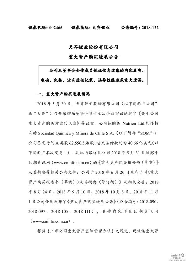 2018年12月3日,天齊鋰業(yè)在智利圣地亞哥證券交易所通過(guò)場(chǎng)內(nèi)交易方式以40 66億美元拍得SQM公司 62,556,568 股 A 類(lèi)股股份(占 SQM 已發(fā)行股份總數(shù)的 23 77%);預(yù)計(jì)本次交易的價(jià)款支付和股權(quán)交割過(guò)戶(hù)相關(guān)手續(xù)將于 2018 年 12 月 5 日前完成(上述時(shí)間為智利當(dāng)?shù)貢r(shí)間)。