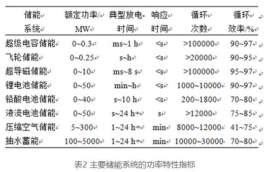 目前,不同國家多采用給定時間尺度風電功率最大波動量,作為風電波動限制指標。該指標的時間尺度和波動幅值分別對儲能系統(tǒng)的功率特性和存儲容量提出了要求。因此,儲能系統(tǒng)的類型選取應重點關注儲能系統(tǒng)的功率特性。表2給出了主要儲能系統(tǒng)的功率特性指標。