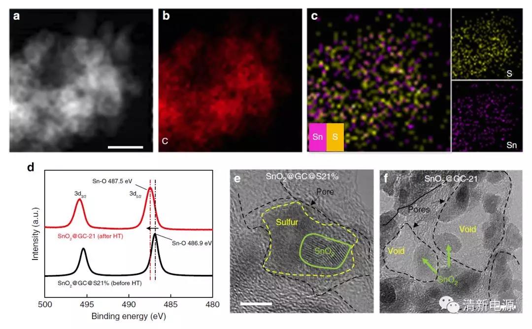 圖2 硫模板的特點(diǎn)。(a-c)硫與SnO2的相間分布狀態(tài);(d)XPS表征硫與SnO2間的相互作用;(e)HRTEM表征硫?qū)nO2的緊密包裹;(f)擁有合適預(yù)留空間的碳籠結(jié)構(gòu)對SnO2顆粒的限域。