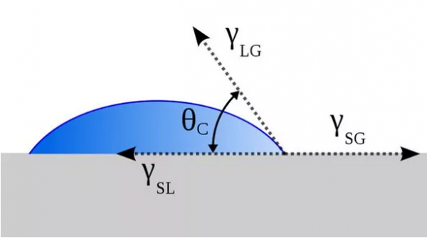 在這個過程中,會涉及到物理化學(xué)中的一個概念“接觸角”(潤濕角)。如下圖所示,圖中藍(lán)色區(qū)域代表液體,灰色區(qū)域代表固體界面。那么藍(lán)色與灰色接觸的區(qū)域則是固液相接觸界面,液體的切線與固體界面交叉的位置形成了一個角度θ,其中接觸角θ越小說明電解液對極片或隔膜的浸潤性越好。