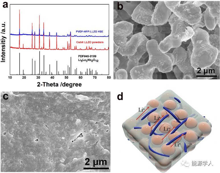 圖1. (a) 制備的LLZO 粉體以及復(fù)合電解質(zhì)膜的XRD 圖譜,(b) LLZO 粉體的SEM照片, (c) 復(fù)合電解質(zhì)膜的SEM 照片, (d) 復(fù)合電解質(zhì)膜中鋰離子傳輸路徑示意圖。
