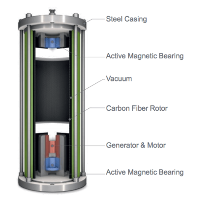 為儲(chǔ)能而開發(fā)的設(shè)備安裝在一個(gè)真空外殼內(nèi),以減少空氣阻力。飛輪也使用連接到轉(zhuǎn)子的發(fā)電機(jī)進(jìn)行充電和放電。