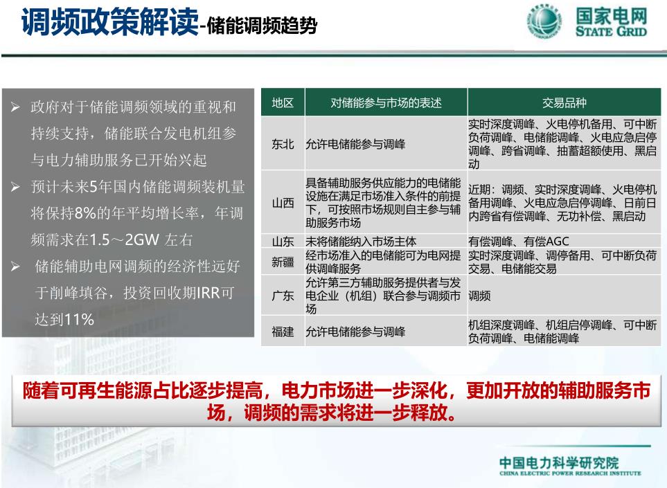 這幾年調頻這么火熱,和國家能源局的這兩個政策是相關的,這個政策明確給了我們儲能一個名分,雖說沒有具體的數(shù)字,但是給我們儲能定位給了明確定義。首先在三北地區(qū),他規(guī)定每個可以干5個左右的調頻電站,首先在量級上有個說法。再一個,儲能或者火電機組聯(lián)合起來這是可以的。還有一種是獨立運行也是合法合規(guī)的。2017年頒布的也是針對這個進行了強化,鼓勵儲能設備做一些相應的服務,并且要求各區(qū)域完善各自的細則。在這兩個導則下,我們西北和華北做了大量的工作。