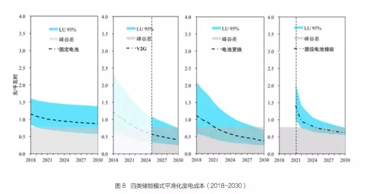 電池更換成本下降軌跡與V2G十分相似,主要差異在于因集中安裝功率轉(zhuǎn)換裝置而降低的投資成本,該儲(chǔ)能模式的峰谷差平價(jià)時(shí)間也因此在四種模式中出現(xiàn)最早(約2022年)。