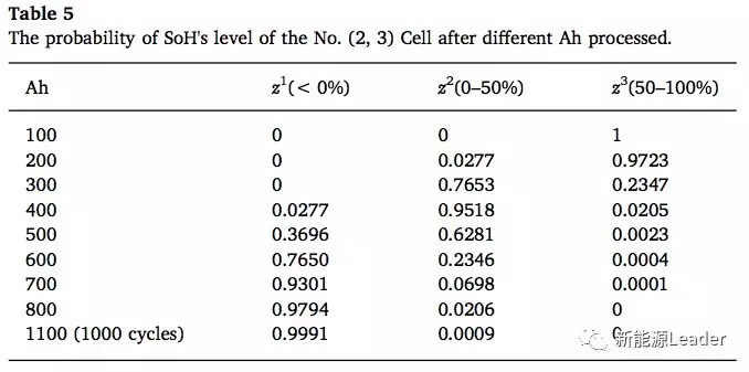 下圖為電池組的仿真結(jié)果,圖b為電池組內(nèi)的溫度分布,圖c為電池組內(nèi)散熱媒介的流動速度分布。根據(jù)電池組內(nèi)的溫度分布,就可以根據(jù)式(11)計算出的到不同單體電池的容量衰降,并據(jù)此計算單體電池的健康狀態(tài)。我們以電池組中最中間的一只電池(2,3)為例,計算了循環(huán)不同的周期后電池衰降到不同狀態(tài)的概率,如下表5所示??梢钥吹皆诮?jīng)過1000次循環(huán)后該電池失效的幾率達(dá)到0.9991。整個電池組在不同的循環(huán)時間后失效的概率如下表6所示,可以看到在經(jīng)過500Ah充電后,電池組失效的概率為0.3754,在充電700Ah后電池組的失效概率達(dá)到0.999。