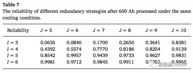 下圖展示了上述的兩種備份模式下,鋰離子電池的可靠性隨著時間變化的曲線,從圖中我們可以看到在經(jīng)過600Ah充電后,沒有備份的3并5串電池的可靠性下降到了0.0635,而有備份的電池組可靠性明顯上升,3并10串電池組的可靠性為0.8381,6并5串電池組的可靠性高達(dá)0.9981,其他的備份方式的電池組可靠性如下表所示。從計算結(jié)果來看,不同的備份模式會對電池組的可靠性產(chǎn)生顯著的影響,在備份電池數(shù)量相同的情況下,并聯(lián)備份能夠顯著的提高電池組的可靠性。但是我們也需要注意簡單的增加備份電池的數(shù)量并不能提高電池組的可靠性,例如同樣在6并的情況下,隨著串聯(lián)電池數(shù)量的增加,會出現(xiàn)可靠性降低的情況,這主要是因為隨著串聯(lián)電池數(shù)量的增加,會導(dǎo)致溫度分布的變化,進(jìn)而降低電池組的可靠性。