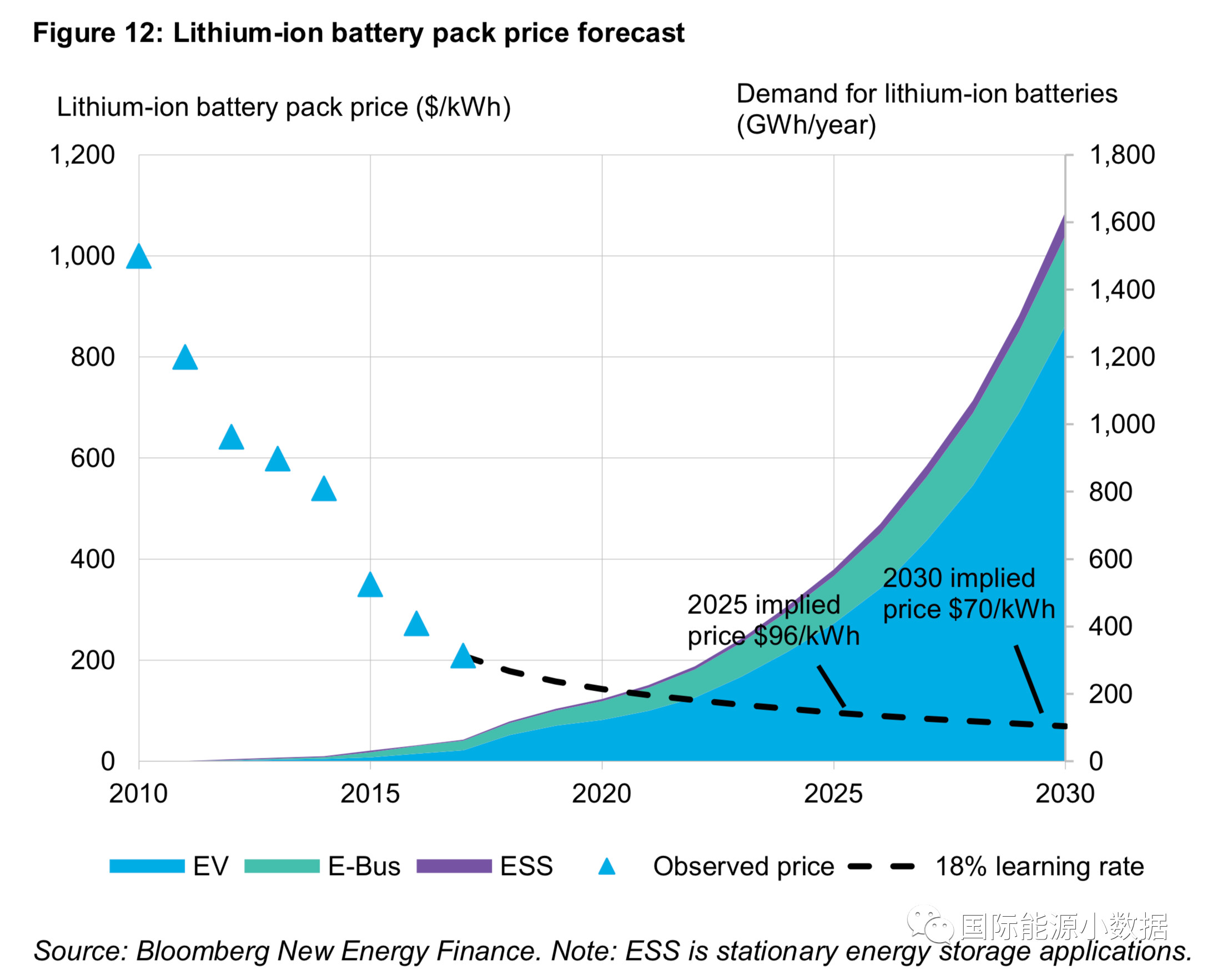 BNEF預測,2025年鋰電池組的平均成本可降至96美元/千瓦時;2030年將至70美元/千瓦時。到2030年,全球對鋰電池組的需求可達16億千瓦時,其中80%將用于電動汽車,其余主要用于電動大巴車。