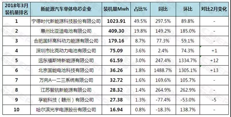圖1:2018年3月國內(nèi)動力電池裝機(jī)量排位前10企業(yè)情況