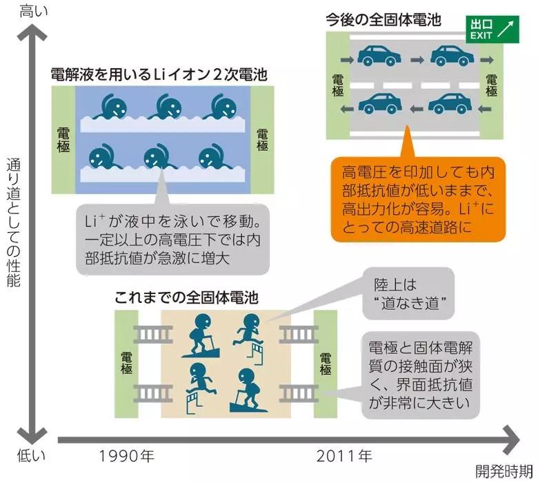 日經(jīng)指出,其實(shí)業(yè)界對(duì)于固態(tài)電解質(zhì)的研究已有20年以上歷史,但如何克服除去電解液后鋰離子的傳導(dǎo)問(wèn)題一直是世界難題,約至2011年各界才相繼傳出突破的消息,不過(guò)最初固態(tài)電池內(nèi)的鋰離子就像佝僂攜杖的老人家,仍因高界面阻抗而無(wú)法高速傳導(dǎo),難以取代傳統(tǒng)液態(tài)鋰電池,因此如何提升導(dǎo)通性成為已研發(fā)出固態(tài)電池的電池廠研究的方向。