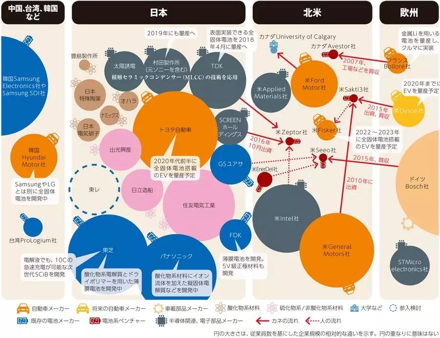 日經(jīng)亦繪制了全球固態(tài)鋰電池技術(shù)分布圖,圖中以圓圈大小示意公司規(guī)模、以箭頭指出公司間投資/合作研發(fā)的關(guān)系,首先可以看出固態(tài)電池生產(chǎn)者除了日韓松下、東芝及三星等超大型企業(yè)外多為小規(guī)模企業(yè),如此規(guī)模落差主因固態(tài)電池難以量產(chǎn),在生產(chǎn)技術(shù)上與一般液態(tài)電池完全不同,不論是生產(chǎn)工藝制程、或是生產(chǎn)線的周遭環(huán)境都需要大量的資本投入和嚴(yán)格參數(shù)控制,所以對(duì)后進(jìn)的新創(chuàng)公司而言,要從實(shí)驗(yàn)室走到量產(chǎn)線的路很長(zhǎng)很遠(yuǎn)很昂貴,因此以固態(tài)電池起家的廠商中除輝能Prologium已開(kāi)始量產(chǎn)外,其余廠家(主要位于北美)皆停留于樣品或?qū)嶒?yàn)階段,尚未擴(kuò)大公司規(guī)模。
