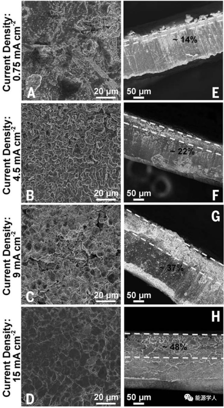 圖1.在電流密度分別為0.75mA/cm2(A和E)、4.5 mA/cm2(B和F)、9 mA/cm2(C和G)、15 mA/cm2(D和H)下,Li-Li對稱電池中Li枝晶的形態(tài)演化。