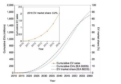 圖1. 國際能源署“高于2攝氏度方案”中提出的電動汽車銷售和電動汽車市場共享演進(jìn)圖
