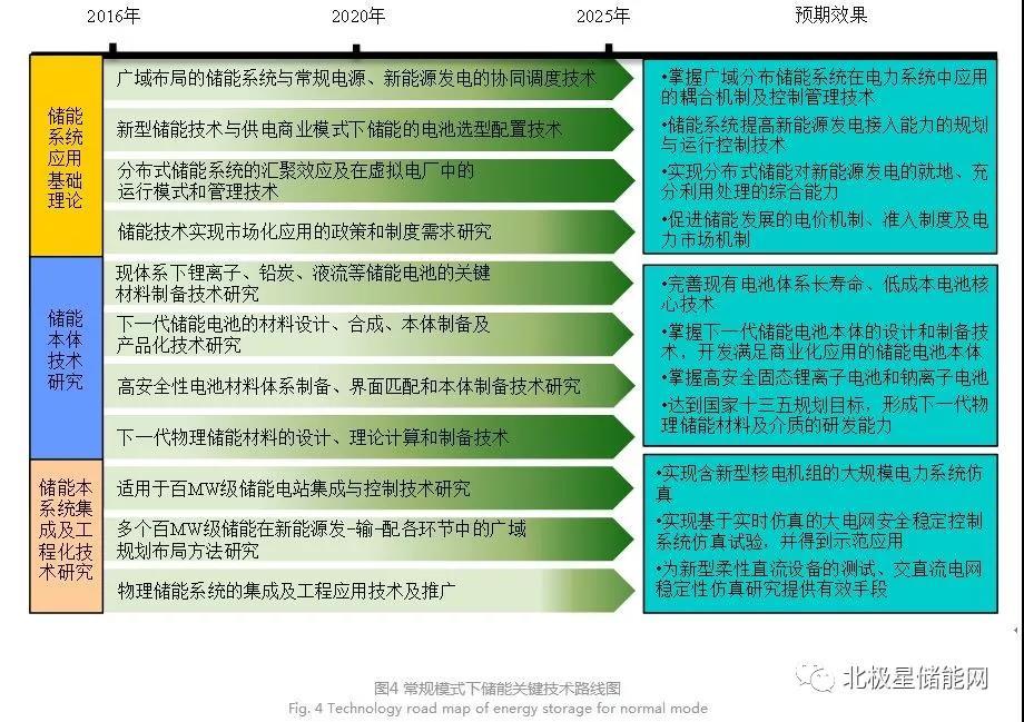 如圖4所示,常規(guī)模式技術路線下,全面掌握戰(zhàn)略布局的先進儲能技術,重點攻關化學儲能、壓縮空氣儲能、高溫儲熱的材料制備和核心裝置制造技術。突破儲能系統(tǒng)集成和能量管理等關鍵技術,實現(xiàn)不同場景不同規(guī)模的示范驗證和推廣應用。構建完備的儲能技術標準體系,形成相對完善的產(chǎn)業(yè)鏈結構。