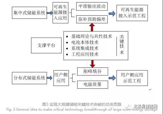 在充分評估該技術領域我國現(xiàn)有水平和國內(nèi)相關科研工作的基礎上,參考國外儲能技術相關技術路線圖,依據(jù)國家電網(wǎng)發(fā)展和建設對大規(guī)模儲能技術的迫切需求,應該以集中式儲能系統(tǒng)在可再生能源接入中的應用、分布式儲能系統(tǒng)在用戶側(cè)峰值負荷轉(zhuǎn)移和提高電能質(zhì)量中的應用為目標和突破口,集中力量解決制約大規(guī)模儲能技術在關鍵部件、容量、壽命、可靠性等方面的制約瓶頸,實現(xiàn)示范應用。同時通過標準體系建設和完善,規(guī)范引導本體技術研發(fā),為儲能技術長期健康發(fā)展奠定基礎,滿足電網(wǎng)發(fā)展和建設對大規(guī)模儲能技術和裝置的迫切要求。