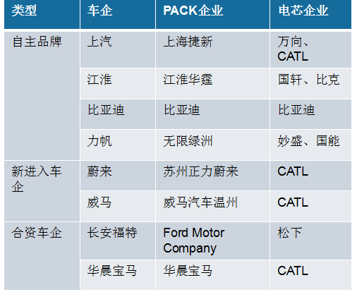 目前乘用車動力電池PACK市場參與企業(yè)主要有三種類型,車企、電池企業(yè)、專業(yè)第三方PACK生產(chǎn)企業(yè),三種類型企業(yè)在PACK環(huán)節(jié)市場上各有優(yōu)劣。