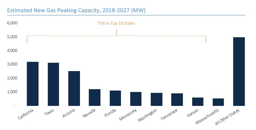 假設(shè)新容量遵循與現(xiàn)有容量相似的運行時間,那么可以預(yù)測,4小時電池儲能系統(tǒng)與平均運行時間少于4小時的天然氣發(fā)電廠運行時間相比更具成本效益。這相當(dāng)于6.4吉瓦,占未來10年峰值容量的32%,而這些大部分市場機會將出現(xiàn)在加利福尼亞州、德克薩斯州和亞利桑那州。