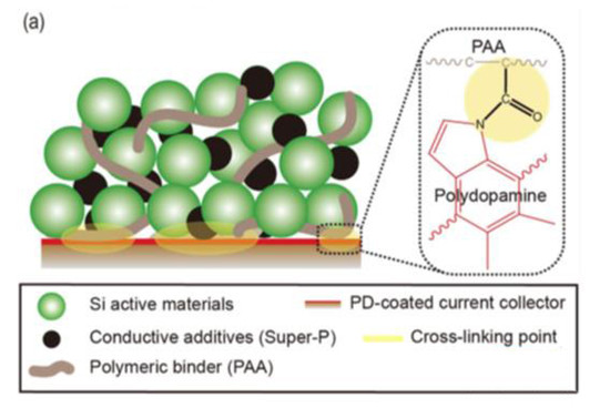 傳統(tǒng)的提升粘接性的方法主要是更換粘接性更好的粘結(jié)劑,但是也有人另辟蹊徑,例如韓國的韓巴大學(xué)的Inseong Cho等人就通過在Cu箔的表面增加一層聚多巴胺涂層的方法增加了活性物質(zhì)與集流體之間的粘接性,減少了循環(huán)過程中電極與集流體分層的現(xiàn)象,從而大幅提升了Si負(fù)極材料的循環(huán)和倍率性能。