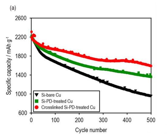 試驗(yàn)中Inseong Cho除了制備聚多巴胺涂層處理的Cu箔外,還對部分處理后的Cu箔在80℃的真空環(huán)境中進(jìn)行了熱處理,從而使得聚多巴胺與電極中的PAA粘結(jié)劑之間發(fā)生縮合反應(yīng),從而進(jìn)一步的增強(qiáng)電極與集流體之間的粘接性,測試表明普通銅箔的剝離強(qiáng)度為245.5N/m,而聚多巴胺涂層處理后的Cu箔的剝離強(qiáng)度提高到了297.5N/m,經(jīng)過熱處理后的聚多巴胺涂層處理Cu箔的剝離強(qiáng)度更是達(dá)到了353.2N/m。更好的粘接性也讓Si材料在循環(huán)性能上表現(xiàn)更加出色,從下面圖中我們能夠看到粘接性最好的熱處理聚多巴胺涂層Cu箔在經(jīng)過500次循環(huán)(0.5C)后,可逆容量仍然高達(dá)1590mAh/g,容量保持率高達(dá)69%,聚多巴胺涂層處理Cu箔的剩余可逆容量為1361.1mAh/g,容量保持率為61%,而沒有經(jīng)過處理的普通Cu箔的剩余可逆容量僅有963.9mAh/g,容量保持率僅為44%。