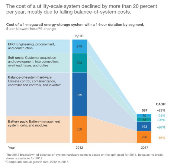 從2012年到2017年,電池成本每年下降超過15%,五年下降超過50%。由其他硬件、軟件,工程、采購和施工(EPC)組成的系統(tǒng)平衡(BOS)成本下降得更快,每年將超過25%??傮w而言,儲能項(xiàng)目的系統(tǒng)平衡(BOS)成本的下降貢獻(xiàn)了電池成本下降所節(jié)省的三倍以上(圖1)。