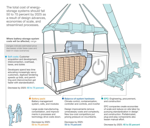 在過去五年中,有幾個(gè)因素導(dǎo)致儲能系統(tǒng)的成本全面下降。全球?qū)οM(fèi)電子產(chǎn)品和電動汽車的需求刺激了對電池技術(shù)的投資,從而降低了每個(gè)組件的單位成本。同時(shí),由于制造業(yè)和供應(yīng)鏈管理的設(shè)計(jì)進(jìn)步和效率提高,其他硬件如逆變器、容器和氣候控制設(shè)備的成本變得更低。隨著企業(yè)積累經(jīng)驗(yàn)并簡化流程,“軟”成本(客戶獲取,許可和互連等)以及工程、采購和施工(EPC)成本下降。