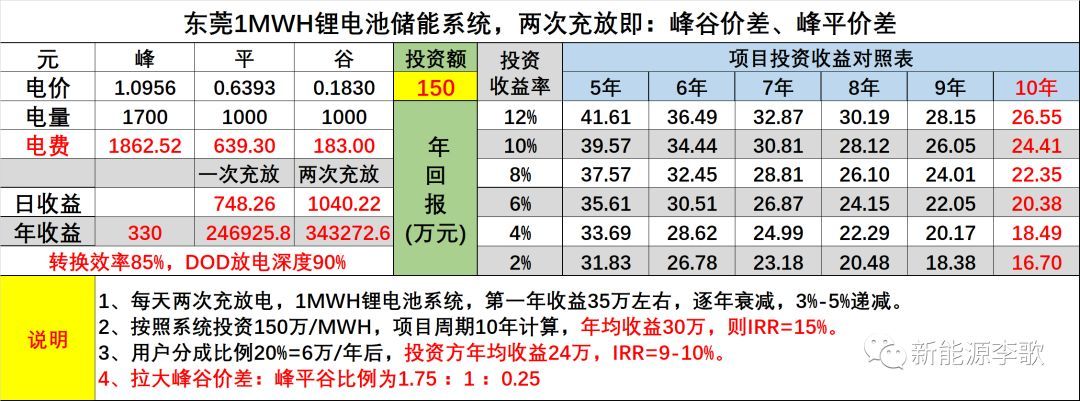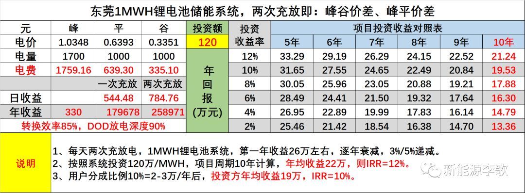 e. 系統(tǒng)成本下降到120萬/MWH,則投資收益率約為10%。