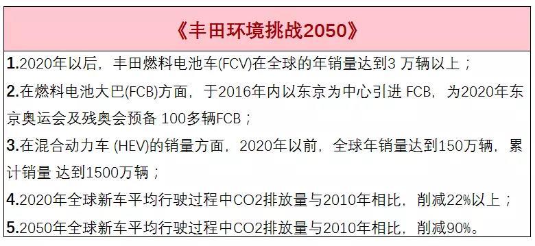 2015年10月15日豐田汽車對外公布《豐田環(huán)境挑戰(zhàn)2050》。豐田計劃,于2020年以后,豐田燃料電池車(FCV)在全球的年銷量達(dá)到3 萬輛以上;在燃料電池大巴(FCB)方面,于2016年內(nèi)以東京為中心引進(jìn) FCB,為2020年東京奧運(yùn)會及殘奧會預(yù)備 100多輛FCB;此外,2050年全球新車平均行駛過程中CO2排放量與2010年相比,削減90%。