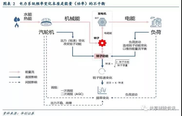電網(wǎng)頻率變化是電網(wǎng)功率不平衡的累計(jì)結(jié)果。 大型同步發(fā)電機(jī)是我國電力系統(tǒng)的主要電源形式,其轉(zhuǎn)子轉(zhuǎn)速與發(fā)電頻率密切相關(guān)。而轉(zhuǎn)子轉(zhuǎn)速的變化,主要由于其動(dòng)能的變化, 當(dāng)轉(zhuǎn)子的輸入能量(機(jī)械能)與輸出能量(電磁能)不一致時(shí),就會(huì)影響其自身的動(dòng)能,造成了轉(zhuǎn)速變化,進(jìn)而改變了發(fā)電頻率。 因此,電網(wǎng)頻率變化實(shí)際上是電網(wǎng)功率不平衡累計(jì)的結(jié)果, 需要不斷的通過“調(diào)頻”進(jìn)行不斷地修正。