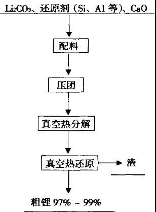 而用真空熱還原法,就是利用碳酸鋰和還原劑來進(jìn)行熱還原,來得到金屬鋰。生產(chǎn)工藝如下: