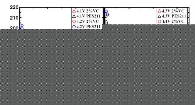 可以看出,在低截止電壓下循環(huán),電池△V較小,而電壓升高到4.3V以上時(shí),△V急劇升高,電池極化加重,這就大大影響了電池的壽命。從圖中也可以看出,VC和PES211的△V變化速率是不同的,這進(jìn)一步驗(yàn)證了電解液添加劑不同,電池極化程度、速度也是不同的。