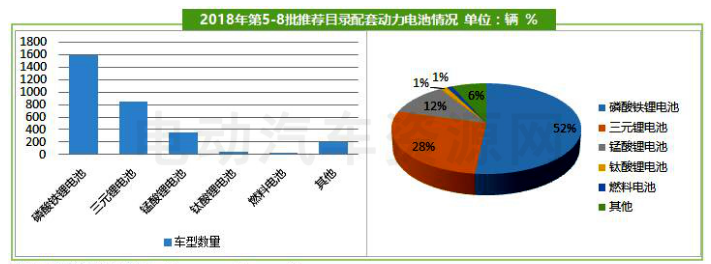磷酸鐵鋰電池在推薦目錄配套中占據(jù)半壁江山,主要是因?yàn)槟壳靶履茉纯蛙囍饕钶d磷酸鐵鋰電池,而新能源客車在第5-8批推薦目錄中占比54%。