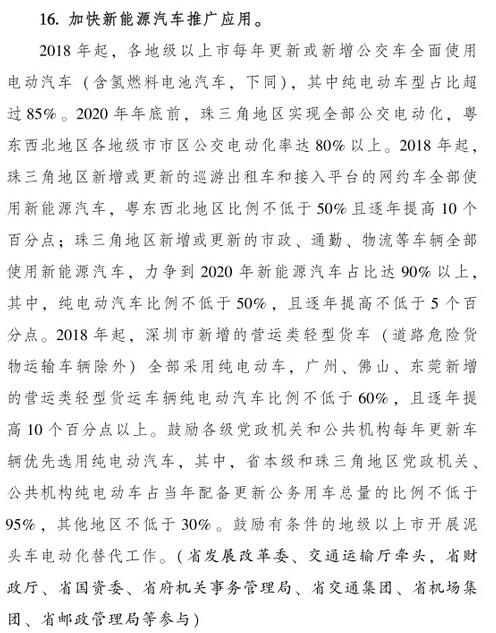 加快新能源汽車推廣應(yīng)用,2018年起,各地級以上市每年更新或新增公交車全面使用電動汽車(含氫燃料電池汽車,下同),其中純電動車型占比超過85%。2020年年底前,珠三角地區(qū)實現(xiàn)全部公交電動化。