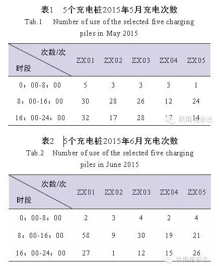 表1~表3為5個(gè)充電樁2015年5月、6月和7月的充電次數(shù),從3個(gè)表可以看出,電動小汽車在辦公區(qū)的公用充電樁上充電主要是8:00-16:00和16:00-24:00這兩個(gè)時(shí)段較多,0:00-8:00時(shí)段充電的較少。分析原因主要是電動私家車晚上回家后一般在家用充電樁上充滿電,電動出租車晚上一般在充電站里充電,所以公用充電樁0:00-8:00時(shí)段用的較少。