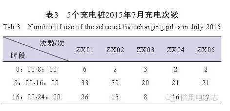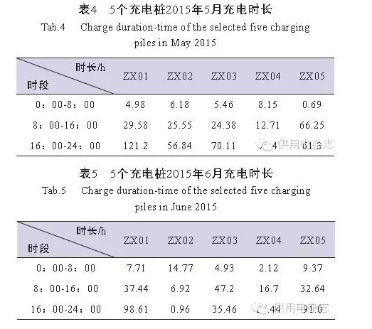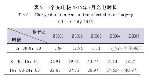 表4~表6統(tǒng)計的為5個充電樁2015年5月、6月和7月的充電時長,可以看出,電動小汽車在辦公區(qū)的公用充電樁上在8:00-16:00和16:00-24:00時段的充電時間要比0:00-8:00時段充電時間長。結(jié)合表1至表3的數(shù)據(jù)計算得出5個充電樁2015年5月至7月每次充電的平均時長,見表7。從表7可以看出,2015年5月至7月每個月每個充電樁每次平均充電使用時長在0.9h至3.27h之間,3個月每個充電樁每次平均充電使用時長約2h。與電動汽車充滿電需要5~6h相比,表明電動汽車在公共收費充電樁上充電以補充電量為主,而主要充電時間在家或者充電站。