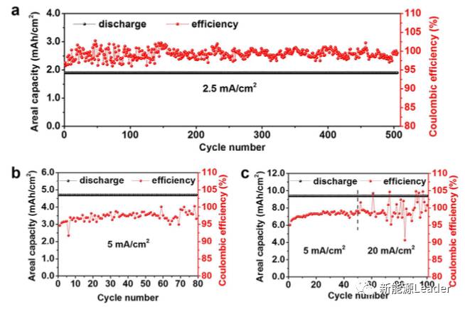 通過提高Li的負載量可以有效的提高負極的面容量密度,下圖a為Li:C=1:5,比容量為643mAh/g,圖b為1:2,比容量為1287mAh/g,圖c為1:1,比容量為1930mAh/g,從圖上可以看到提高Li負載量后,多孔碳Asp-GNRs材料仍然保持了很高的庫倫效率和循環(huán)性能。
