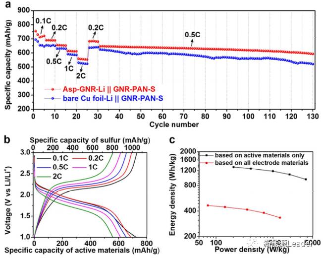 下圖為TuoWang利用Asp-GNRs材料作為負極,硫碳混合物(S-C)材料作為正極制備的全電池的測試數(shù)據(jù)。從圖a中我們可以看到,在0.1,0.2,0.5,1和2C倍率下,材料的比容量分別達到720,690,655,613和559mAh/g,表現(xiàn)出了非常好的倍率性能。在0.5C的倍率下循環(huán)100次容量保持旅可達92%,遠高于使用裸露銅箔負極的對照組。全電池的功率密度可達1322W/kg,能量密度可達943Wh/kg。
