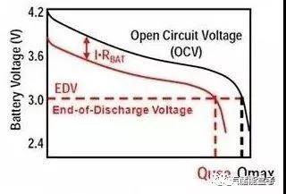 用數(shù)據(jù)說話,下圖表示一電池放電曲線,X軸表示放電量,Y軸表示電池開路電壓,電池理想放電狀態(tài)為黑色曲線,紅色曲線是考慮到電池內(nèi)阻時的真實狀態(tài)。