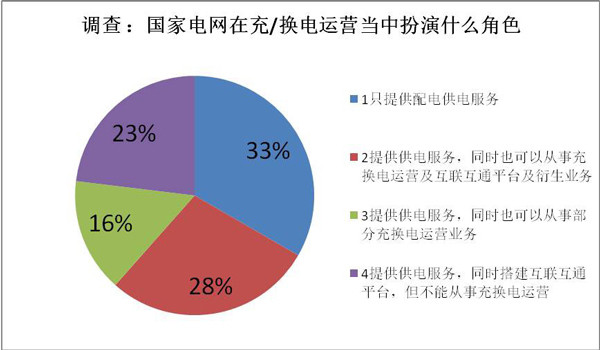 33%的調(diào)查者認(rèn)為,國家電網(wǎng)應(yīng)當(dāng)只提供配電供電服務(wù);另外,有23%的被調(diào)查者認(rèn)為,國家電網(wǎng)在提供供電配電服務(wù)的同時,可以搭建互聯(lián)互通平臺,但不應(yīng)該從事充換電運(yùn)營。兩者相加,等于有56%的被調(diào)查者認(rèn)為國家電網(wǎng)不應(yīng)該從事充換電運(yùn)營。
