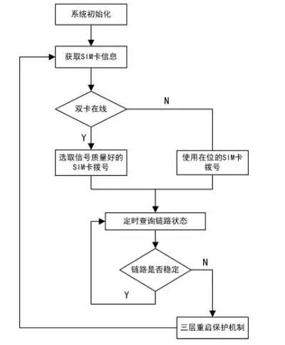 其中,判斷SIM卡在位狀態(tài)為兩層測(cè)試,兩次獲取失敗才會(huì)判定為不在位,如果在位,則挑選通信質(zhì)量較好的SIM卡進(jìn)行撥號(hào),然后進(jìn)一步通過(guò)“PPP設(shè)備是否在位、IP地址是否正確、周期內(nèi)是否產(chǎn)生流量”判斷鏈路穩(wěn)定質(zhì)量,如果不穩(wěn)定則需重啟設(shè)備。